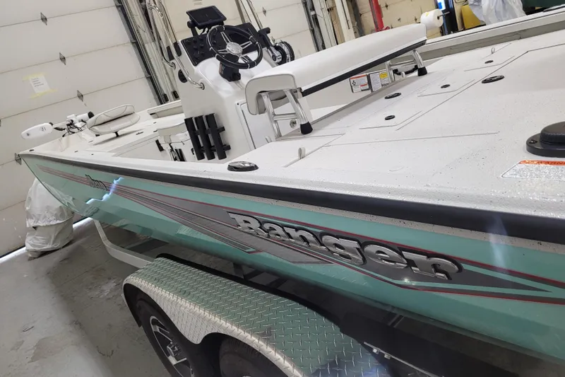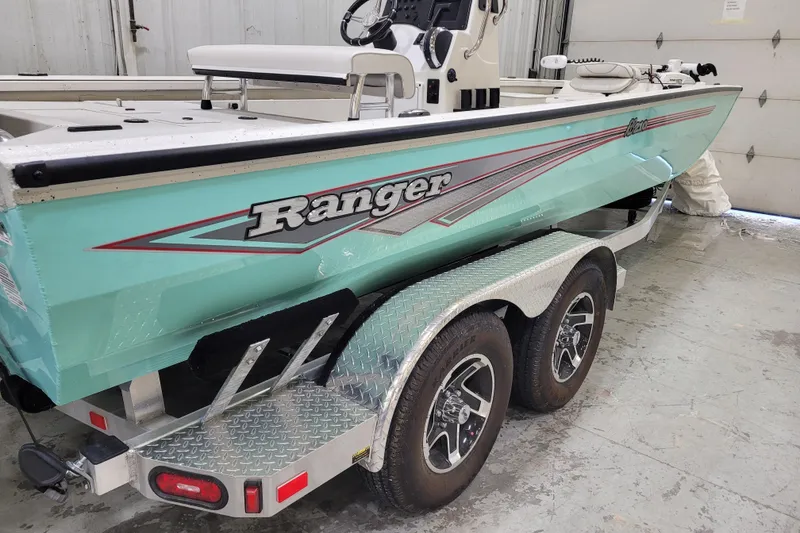 The all-new RB210 packs more muscle in a bigger hull for greater performance, stability and capability to take you further than ever. The pad-bottom hull is designed for a dry ride that planes in a hurry, even in the shallows. The all-welded hull delivers strength in chop while precision steering and throttle control give you the ultimate in command. The wide, stable front casting deck delivers huge room for multiple anglers, and the interior is perfectly tailored for taking on inshore fisheries or a bass tournament with dual livewells and rod boxes, a huge in-deck storage and storage under the rear jump seats. At the helm, electronics up to 9" may be flush mounted and membrane-style switching delivers convenient simplicity. The ruggedized Ranger Trail® trailer is constructed with all-welded aluminum for the utmost in corrosion-resistant strength. Diamond plate fenders offer a step up and protection from road debris. A new camo version is more than just a paint scheme, this special rig features blacked-out badging, matte black closures and console railing, along with an all-black steering wheel for maximum concealment. No matter where your quarry swims, the enhanced capability of the RB210 is designed to Dominate Inshore and Nearshore.