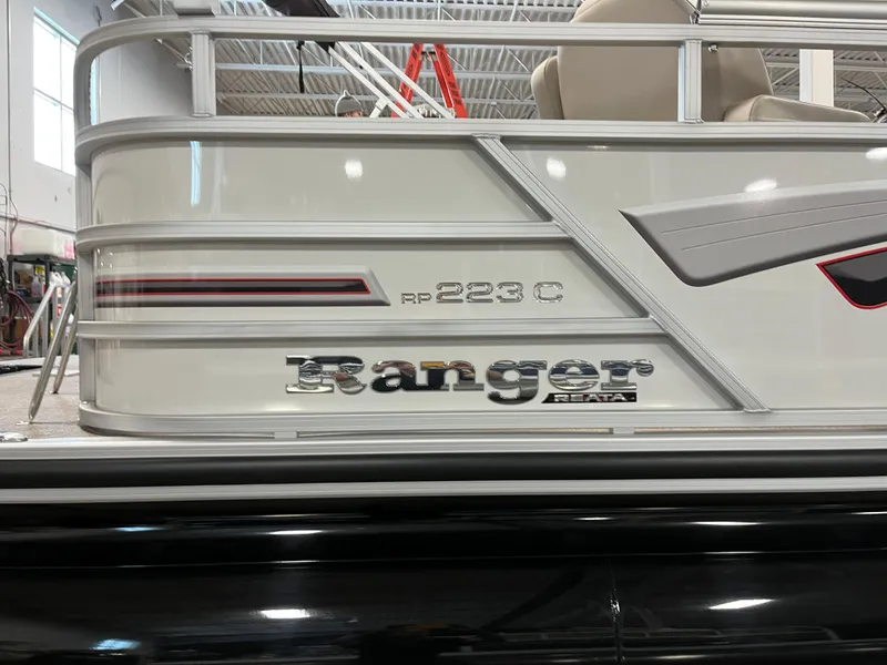 Smooth, solid power, refined luxury and maximum convenience define the Ranger® Reata® 223C. With three powder-coated pontoons, hand-crafted seating and an 11-foot Bimini top, this pontoon is ready to move you in comfort and style. A full-width rear swim platform with boarding ladder are adjacent to the PowerPod™ motor extension that delivers enhanced performance and a quieter ride. Within the redesigned gates is luxury from top to bottom, from the soft-touch woven flooring to the extra-plush lounges and overstuffed captain's chair. Storage beneath every seat and under the console easily hold a day's worth of gear while a 200-horsepower rating ramps up excitement on demand. With so much capability, the Ranger 223C delivers high performance, even at 0 MPH.