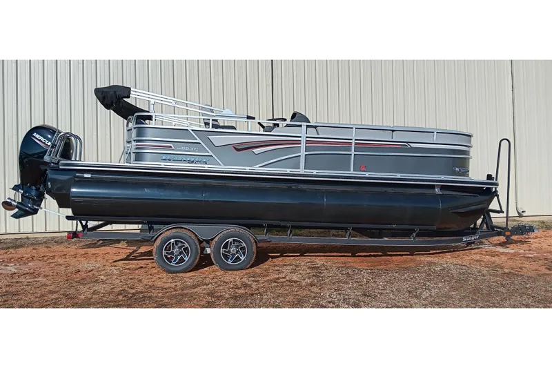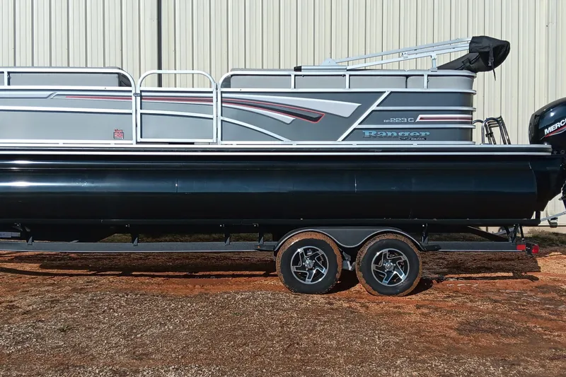 Smooth, solid power, refined luxury and maximum convenience define the Ranger® Reata® 223C. With three powder-coated pontoons, hand-crafted seating and an 11-foot Bimini top, this pontoon is ready to move you in comfort and style. A full-width rear swim platform with boarding ladder are adjacent to the PowerPod™ motor extension that delivers enhanced performance and a quieter ride. Within the redesigned gates is luxury from top to bottom, from the soft-touch woven flooring to the extra-plush lounges and overstuffed captain's chair. Storage beneath every seat and under the console easily hold a day's worth of gear while a 200-horsepower rating ramps up excitement on demand. With so much capability, the Ranger 223C delivers high performance, even at 0 MPH.