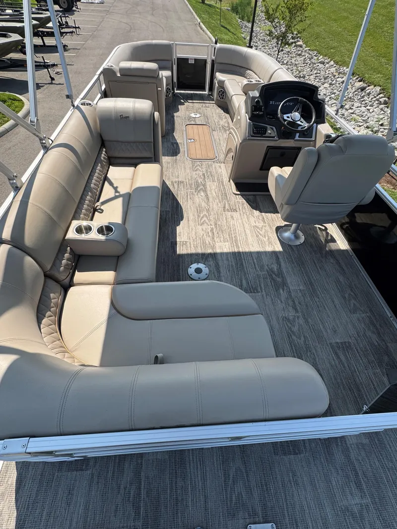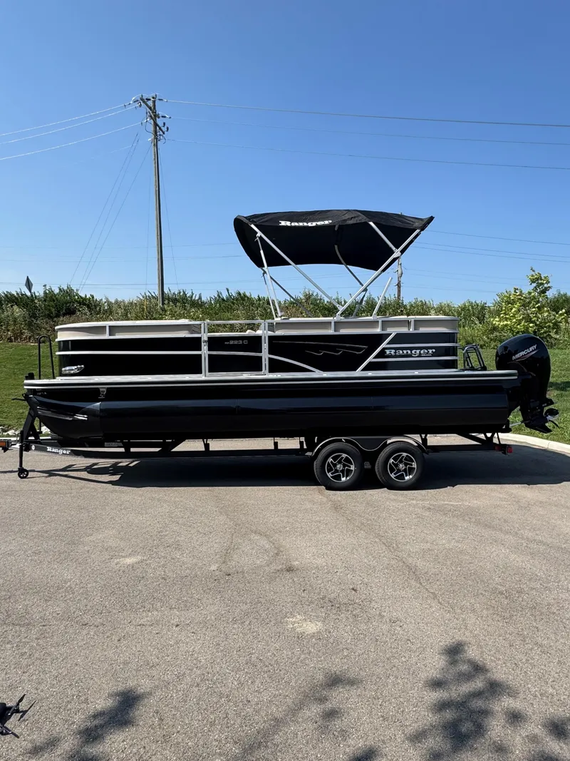 Smooth, solid power, refined luxury and maximum convenience define the Ranger® Reata® 223C. With three powder-coated pontoons, hand-crafted seating and a Dowco EasyLift™ 10-foot Bimini top, this pontoon is ready to move you in comfort and style. A full-width rear swim platform with boarding ladder are adjacent to the PowerPod™ motor extension that delivers enhanced performance and a quieter ride. Within the redesigned gates is luxury from top to bottom, from the soft-touch woven flooring to the extra-plush lounges and overstuffed captain's chair. Storage beneath every seat and under the console easily hold a day's worth of gear while a 200-horsepower rating ramps up excitement on demand. With so much capability, the Ranger 223C delivers high performance, even at 0 MPH.