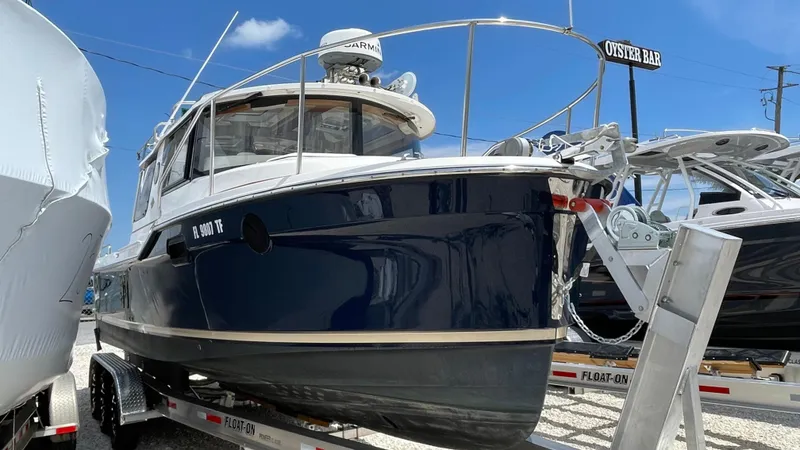Engine Yamaha F250 outboard engine LOA (motor down) 28' 5" 8.66 m LOA (motor up) 29' 8" 9.04 m Draft (motor down) 34" 0.86 m Draft (motor up) 19" 0.48 m Beam 8' 6" 2.59 m Bridge clearance (mast down, w/ radar) 8' 6" 2.59 m Height on factory trailer (mast down, w/ radar) 11' 10" 3.61 m Height on factory trailer (mast down, w/o radar) 11' 2" 3.4 m LOA on trailer (motor down) 34' 6" 10.52 m LOA on trailer (motor up) 36' 10.97 m Fuel capacity 99 US gal 374.8 L Water capacity 34 US gal 128.7 L Waste capacity 14 US gal 53 L Weight, dry 6,500 lbs 2,949 kg