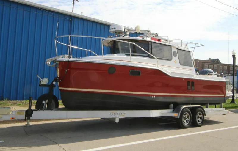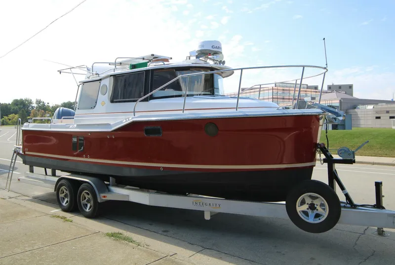 This R-25 with only 9 hours on the Yamaha F250XSB outboard is a feature-packed, trailer-able cruising yacht designed for comfort, ease of use, quality and fun. Well Optioned with Radar, Auto Pilot, Electric Grill, Bimini and Sunshade Extention, Hero Red Hull Color, and Lithium Battery Package with Air Conditioning, Inverter and Solar Panel options. Also this boat has been Epoxy Barrier Coated and Bottom Painted!
