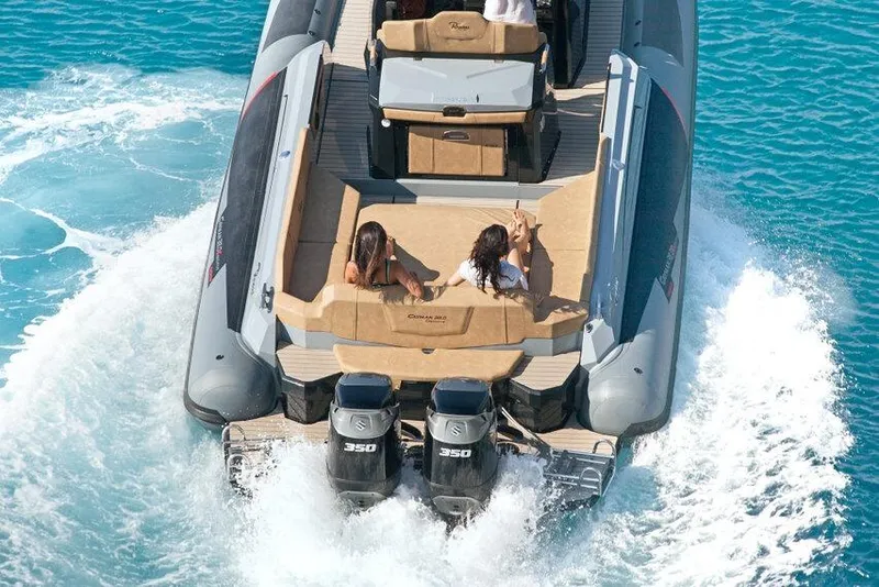 Built on a deep-V high-performance fiberglass hull paired with premium Hypalon inflatable tubes, this 38-foot center console RIB offers a smooth, stable, and dry ride in a wide range of sea conditions. The advanced stepped hull design enhances fuel efficiency, handling, and acceleration, making it equally capable for high-speed cruising and relaxed touring.