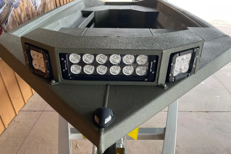 The features of this boat are the following: mid-deck, painted bottomland camo, non-skid liner, stacked gun trays, grab handle, trolling motor wiring and bracket, switch panel, bilge kit, LED rear lights, green LED interior strip lights, LED light bar with housing.