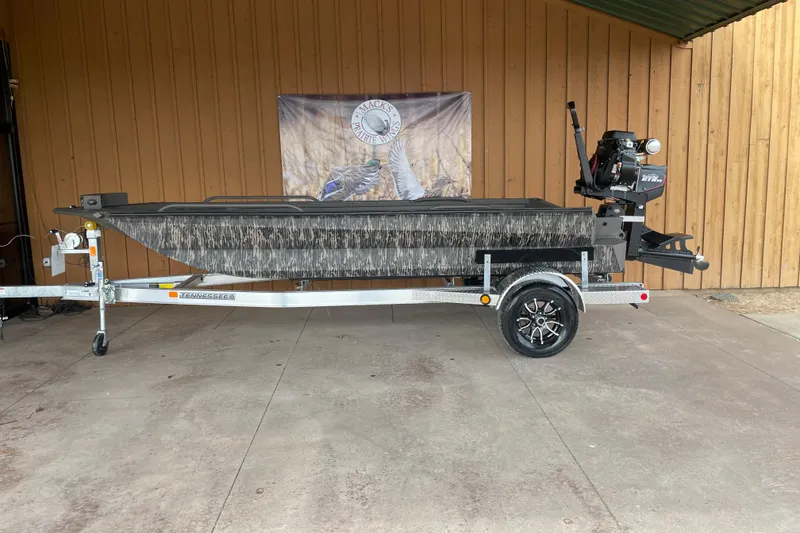 Features on this boat include the following: step transom, mid deck, painted bottomland camo, non-skid liner, gun box, stacked gun tray, grab handles, bow rails, surface drive grab handle, trolling motor wiring and bracket, bull bar, switch panel, bilge kit, LED rear lights, green LED interior strip lights, LED light bar with housing.