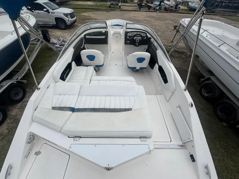 Patented 'Fastrac' stepped-hull design, swim platform, stainless telescoping boarding ladder, in-platform storage locker, stainless ski tow eye, walk-thru transom w/ acrylic door & magnetic latch, sundeck w/ sunpad & gas assisted ram, storage tub- removable at aft bench seat, full f/g lined cockpit liner w/ drain, L-shaped bench seating w/ storage, removable cooler, passenger bucket seat, captains bucket seats w/ adjustable height option and pop-up bolster, ski-locker w/ frp lid & gas assist ram, aluminum framed windshield w/ walk-thru flap, bow seating & w/ backrest 'Storemore' lockers, ss gunwale moulding, ss pull-up cleats, ss fender cleats, docking lights, ss bow scuff plate, bimini top, classic white gel-coat with in-mould blue accent stripes