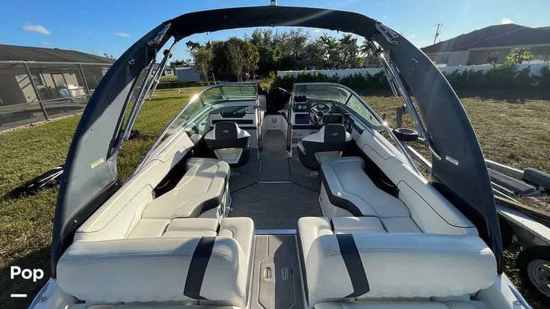 This boat features a powerful Volvo Penta Dual Prop Sterndrive for superior handling, acceleration, and efficiency, making it ideal for watersports, cruising, or family fun. It comes with an electric Power Tower that easily folds down for storage and trailering or up for wakeboarding, towing, with integrated bimini shade.