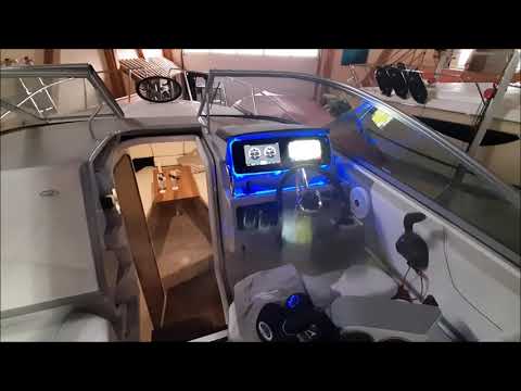 The boat features blue ambient deck lighting, a Garmin dual-screen dash navigation system, Bow thrusters, and a stereo system with six speakers.