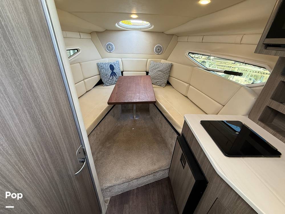 Entertainment is top-notch, with a flat-screen TV and two Fusion Marine sound systems--one in the salon and the other at the helm--both connected to quality speakers for crisp, immersive audio. The galley is beautifully appointed and functional, featuring a microwave, alcohol stove, stainless steel sink, refrigerator/freezer, ample counter space, and plenty of cabinet storage for all your essentials.