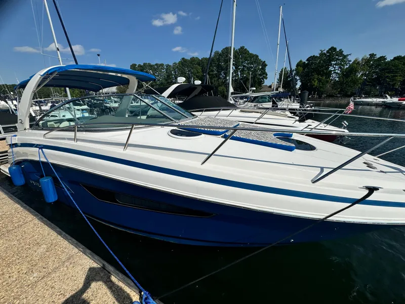 Fresh water only. Everything is working properly on this well maintained and loaded Regal 32 Express. What an amazing layout. The motors are twin Volvo Penta 300 hp V8 sterndrives with Duo Props and it includes the bow thruster. Only 240 hours on the motors. It is loaded with generator, Heat/AC, full instrumentation, awesome upgraded stereo system with amps and subwoofers, huge swim platform, windlass and more. The rear bench seat lays out into a bed and also slides forward and/or backwards to increase cockpit space or swim platform space depending on where you're hanging out. It has the feel of a much larger cruiser. In the cabin, there is great headroom and also a lot of space. The V-berth is shortened to make the main cabin area larger and then the end of the bed hydraulically flips out to lengthen the bed when you need it so it again gives you much more interior space than it would otherwise have. It has the vacuum-flush head, King size bed in the aft cabin and Versace sheets! There are two SS fridges, one in the cockpit and the other in tha galley area of the cabin. It also has an electric grill in the cockpit. The custom cover and bimini are in great shape. It's loaded.