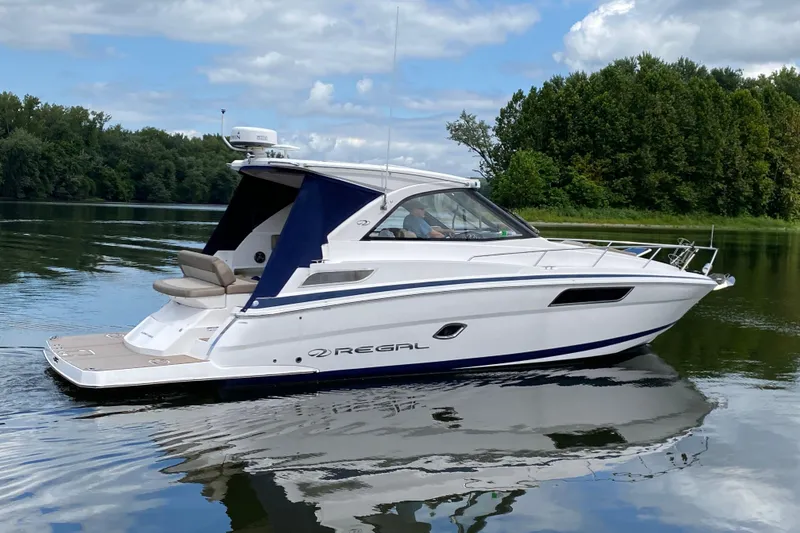 Introducing the Regal 35 Sport Coupe, a stunning express cruiser from 2014 that combines elegance with performance. Measuring an impressive 36.83 feet in overall length, this vessel boasts a sleek fiberglass hull with a deep Vee shape, ensuring smooth navigation and stability on the water. Powered by twin Volvo Penta V8 engines, each delivering 300 horsepower, this boat offers exhilarating speed and responsiveness, perfect for both leisurely cruising and spirited adventures. With only 518 and 517 hours of use, these engines are in excellent condition, ready for your next journey. The Regal 35 Sport Coupe is designed for comfort and style, making it an ideal choice for those who appreciate quality craftsmanship. Its thoughtful features enhance the boating experience, providing a perfect blend of luxury and functionality. Experience the joy of the open water with this remarkable vessel, aptly named "JUST TRADED."