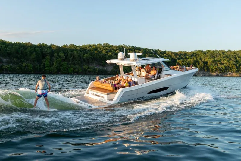 Introducing the stunning 2026 Regal 38 Surf, a new Cuddy Cabin boat that embodies elegance and performance. With an impressive overall length of 39.17 feet, this vessel is crafted from durable fiberglass, featuring a modified Vee hull shape that ensures a smooth ride across the water. Equipped with powerful inboard/outboard engines fueled by gasoline, the Regal 38 Surf promises exhilarating adventures on the waves. Its innovative design includes a well-appointed head, enhancing comfort for all onboard. This boat is not just about functionality; it is designed for an enjoyable experience, making it perfect for both leisurely cruises and thrilling outings. The Regal 38 Surf combines style and practicality, making it an exceptional choice for boating enthusiasts seeking a modern and reliable vessel. Experience the joy of the open water with this remarkable boat, where every journey becomes a memorable adventure.