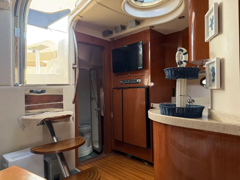 A scaled-down version of Regal's 4260 Commodore, the 3860 Commodore has a number of attributes that make her a strong contender in the luxury cruiser market. Built on a modified-V hull with a solid fiberglass bottom, her two-stateroom interior differs from other mid-range express cruisers in that a second head compartment is tucked into the aft stateroom-a convenience seldom found in a boat this size. Both staterooms come with sliding privacy doors (rather than curtains), and a hardwood floor in the galley accents the high-gloss cherry joinery in the salon. In the cockpit, a semicircular settee offers plenty of guest seating. A wet bar is standard and a walk-through windshield provides bow access. Note that the entire rear deck of the cockpit lifts hydraulically to permit walk-in access to the engine compartment from the swim platform. Additional features include a foredeck sun pad, an anchor washdown, and a power windshield vent.
