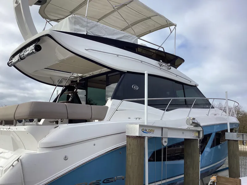 Well maintained, lift kept, low hours one owner 2018 Regal 42 Fly. The Regal 42 is a twin-stateroom flybridge yacht designed for cruising and entertaining. The styling is crisp and modern with large salon windows and four hull windows to brighten up the staterooms. The 42 Fly has galley-up interior with sliding glass doors that open the entire salon to the back deck. The galley opposite the elevated dinette/settee to port, has a sink concealed cooktop, convection/microwave oven and double door refrigerator.