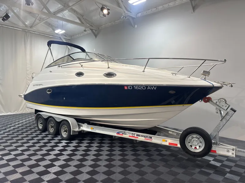 2007 Regal 2665 Commodore, The 2007 Regal 2665 Commodore combines contemporary styling, performance, and comfort in a well-crafted express cruiser designed for extended days on the water. Built on Regal's FasTrac hull, it delivers faster planing, improved fuel efficiency, and a smooth, stable ride. The spacious cockpit features a double-wide helm seat, wraparound lounge, wet bar, and extended swim platform for easy water access. Below deck, the cabin includes a full galley, enclosed head, convertible V-berth, and mid-cabin berth, offering overnight accommodations for four. Powered by a Volvo Penta sterndrive, the 2665 Commodore delivers reliable performance, efficiency, and handling that reflect Regal's commitment to innovation and quality craftsmanship.