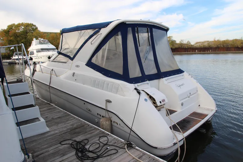 The Regal 322 Commodore was a notably popular model for Regal. (Indeed, it's a rare event when a major manufacturer keeps a boat in production for a full decade.) Built on a deep-V hull with cored hullsides, the deluxe interior of the 322 Commodore is a blend of high-end furnishings and quality components. The floorplan is arranged with an angled double berth forward, a posh Ultraleather sofa/dinette in the salon, and handsome U-shaped aft cabin seating that converts into a queen-size bed. On deck, the cockpit is set up with a double-wide helm seat forward, wraparound guest seating aft, a built-in wet bar, and a transom door. An electric engine hatch provides access to the motors. Additional features include a radar arch, walk-through windshield, foredeck sun pad, and large transom lockers. A fast boat with 300hp MerCruiser sterndrives, the Regal 322 will cruise at 25 knots (low 40s top).