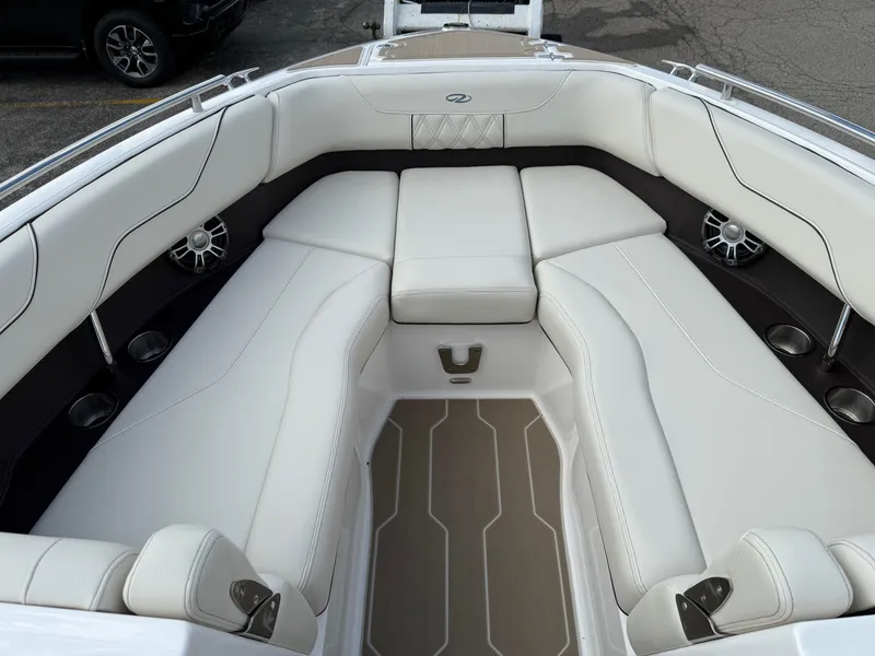 The 2025 Regal LS6 is a 26-foot bowrider designed for both leisure and adventure, offering a perfect blend of style, comfort, and versatility. It features ample seating areas, including a spacious bow, transom lounging space, and ergonomic captain and co-captain chairs, making it ideal for socializing and relaxation. Constructed with fiberglass, the LS6 is lightweight yet sturdy, with a sleek design and a focus on innovative, user-friendly features.