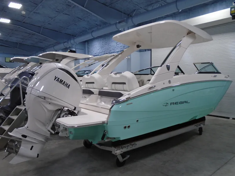 2025 REGAL LX4 IN SEAFOAM GREEN WITH A TITANIUM INTERIOR, POWERED BY A 300HP 4.2L V6 YAMAHA SINGLE OUTBOARD. EQUIPPED WITH A TRAVEL STORAGE COVER, BATTERY CHARGER, BOW THRUSTER, TRANSOM SHOWER & PRESSURE WATER PACKAGE, TRIM TABS, A HEAD COMPARTMENT, ELECTRIC PUMPOUT TOILET, DOCKING LIGHTS, FENDER CLIPS, BLUE UNDERWATER LIGHTING, UPGRADED FUSION STEREO PERFORMANCE AND LIGHTING PACKAGE, DUAL GARMIN 943XS UNITS AT HELM + B60 TRANSDUCER, PREMIUM PACKAGE, AND FULL POWER HARDTOP.