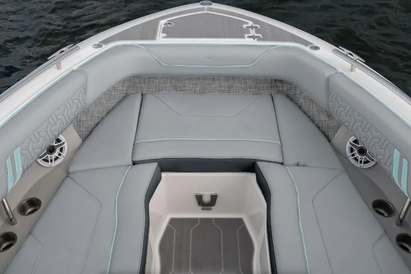 Some of the popular standard features include custom interior with belle isle blue accents, Yamaha Helm Master with Joystick, digital switching, bow thruster, transom shower, bow walk-thru doors, stereo performance and lighting package, dual Garmin 1243XSV with B60 transducer and stainless steel flag pole.