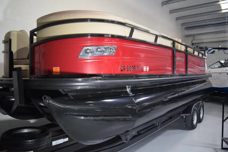 Speaking of planing, the 230 DL3 features three 26" pontoon logs with four total lifting strakes (two on center log, one on each outboard log). Combined with up to a 250-horsepower outboard, deck underpinning and hydraulic steering, this provides runabout-style handling underway.