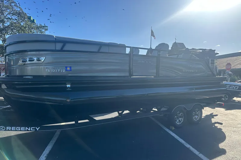 2024 Regency R230LE3 Sport with a 250hp motor and tandem axle trailer.
