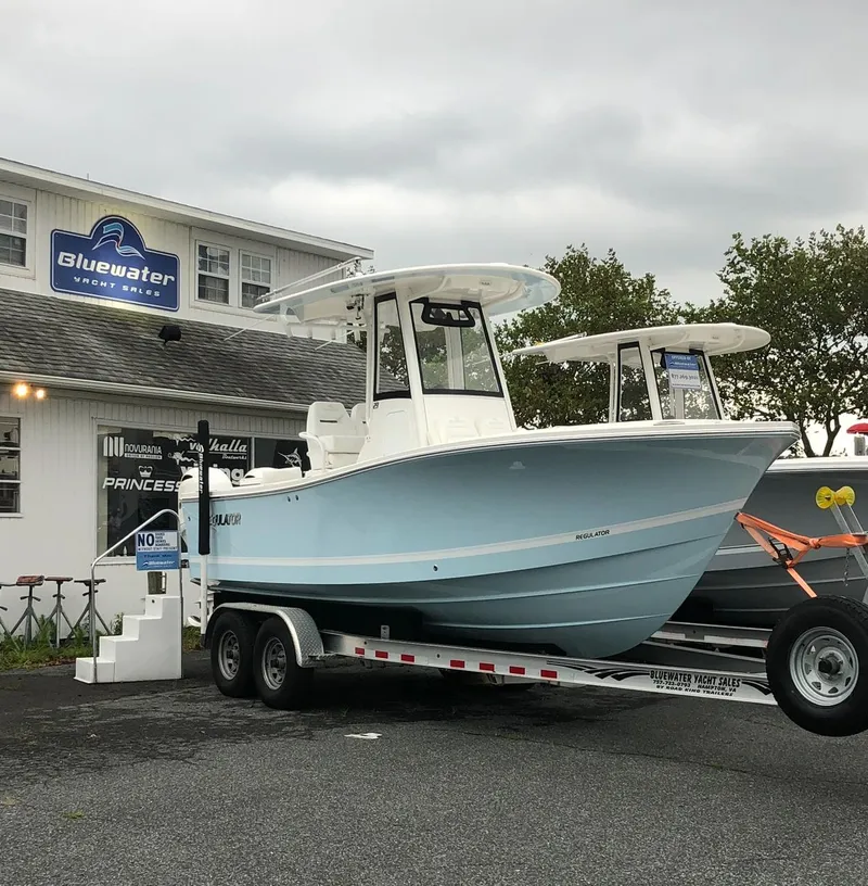 GORGEOUS NEW TO MARKET 202O 23' REGULATOR IS NOW AVAILABLE AND READY FOR HER NEXT OWNER! THIS VESSEL SHOWAS EXTREMELY WELL, AS IT SHOULD WITH 100 HORS ON HER TWIN 150 HP YAMAHAS. IT'S FS PACKAGE ALSO BOASTS A COMPLETE CAROLINA BLUE HELL WITH MATCHING T-TOP UNDERSIDE, A TABLE FILLER FORWARD AND CUSTOM SKI POLE MOUNTED AND REMOVABLE ON HER STERN.