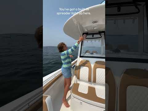 - Fiberglass T-Top with Surfboard Edges, Spreader Lights, and Multi-Colored LED Lights – Complete with Integrated, Vented, Wraparound Windshield