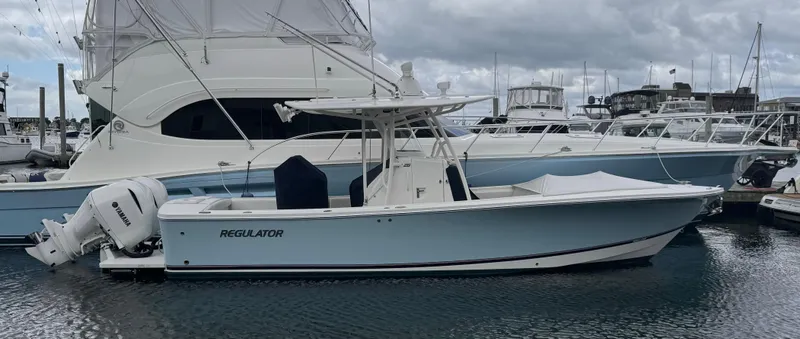 Step up performance with a fishing machine built for offshore action. With its sharp bow entry and Lou Codega-designed hull, Regulator’s signature soft ride comes standard. The 28 Tackle Center, seatback rod holders, and optional T-Top rocket launchers create an ideal rigging station for a group of anglers, putting all of your tackle within perfect reach. Twin Yamaha F300s give you the power to explore, and the transom walkthrough tuna door provides flexibility for both boarding and fishing. Optional sunbed table and removable forward seat backrests add an extra degree of comfort for days spent lounging and entertaining on the water, making the 28 the ultimate expression of the Offshore Life.