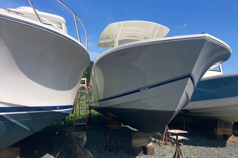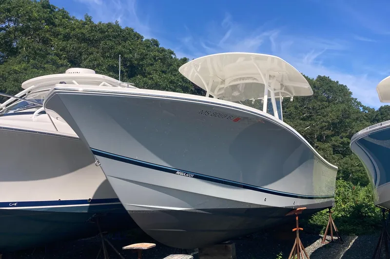 28' Regulator Center Console FS: 2018 - Twin F300hp Yamaha 4-Stroke Engines Optimus 360 Joystick Control System; STORM GREY HULL COLOR; Forward Seating w/ Forward Seat Backrests & Custom Canvas Covers; Custom Powder Coated Molded T-Top; Custom EZ2CY Enclosure; Deluxe Tackle Center w/ (4) Rod Rocket Launcher; Integrated Flush Folding Transom Stern Seat; Walk-Thru Transom Door; Enclosed Marine Head w/ Fresh Water Toilet & Sink; Garmin Touch Screen Electronics; Polk Stereo System w/ (4) Speakers; One Owner !! Lightly Enjoyed; Serviced & Maintained by New England's Premiere Regulator Dealer; Oyster Harbors Marine; Superb Condition !! Immediate Delivery Available !! Transferrable Warranties !!