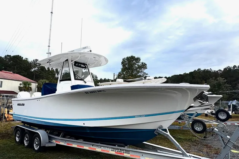 Super nice super clean popular 28 Regulator FS with twin 300 Yamahas ( white) with very low hours . She has all the toys needed and more . Hardtop with Rupps - Twin screen Garmins with radar plotter sounder and AP . She has a joystick - the bow thruster - forward seating- thru anchor with windlass - twin deluxe captain helm chairs , aft seating - tabs - console with head with FW sink - covers - the MagicTilt trailer is included and more . Don't hesitate as boat is ready for her new owner . Available for co-brokerage and located in SC