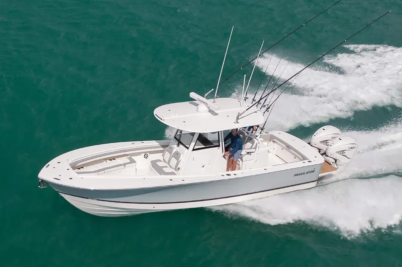 Welcome aboard the fastest boat in our fleet - reaching top speeds of 64 MPH equipped with twin Yamaha 425s. The Regulator 31 overdelivers at every turn. Yamaha Helm Master® EX option with Joy Stick, gives you the power and flexibility to handle beautifully in any waters - and Ready to fish? The massive cockpit, oversized tackle center, fishbox/livewell action, and optional Taco® Grand Slam 390 outrigger bases with 20' Carbon Fiber telescoping poles deliver everything you need for a serious day of sportfishing. Upgraded to the 3X Deluxe Mezzanine Tackle Center for additional seating, storage, and dual-flanking rocket launchers that keep your rods at hand when the bite is hot. Three piece enclosure and electric Sure Shade for full sun protection and time on the water. No matter how you outfit your ride, you'll have plenty of deck space and offshore comforts including the starboard boarding and dive door, flip-up forward seat backrests, and optional forward sun shade and cockpit electric SureShade® to keep you cool in any waters. Opportunity knocking, Call or stop by KMC Marine for more information on this amazing deal. NO Appointment necessary, can be seen 6 days a week while it lasts. Financing available W.A.C NO TRAILER - We can get you a new trailer if needed.