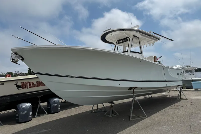 New 2026 Regulator 31 powered by twin white Yamaha XTO Offshore 4-stroke engines w/ Digital Electric Steering with Tilt Helm, Digital Electric Controls, EX Autopilot with Waypoint Deceleration and Electronic Key Switch with Wireless Key Fob. Helm Master EX Joystick with Multi mode Set point. White entire hull. Seakeeper Gyro Stabilization System READY (for future installation). Abaco Sky Entire Hull color. Bracket with Synthetic Teak Marine decking. T-Top Rocket Launcher. Gemlux Bluewater Outrigger Bases with Lee's Ultima 22' Carbon Fiber Outrigger Poles and rigging management system. T-Top underside color (Navy) different than the hullsides (white). T-Top storage compartment. 3X Deluxe Mezzanine Tackle Center with Aft facing mezzanine seating for two with recessed footrest, folding armrests, w/ (2) cup holders, and tackle storage options to add dual flanking seatside rocket launchers. Fiberglass Sun Bed with Magnetic Filler Cushion and Convertible Pedestal Table. Diamond Quilted Upholstery. Teak Accents on Helm Armrests, Forward Console Armrests and Mezzanine Seat Armrests. Factory Installed Garmin GMR Fantom 54 Open Array Radar. Factory Installed Garmin GXM 54 SiriusXM Marine Weather Receiver. Entertainment Upgrade Package: includes Fusion Dynamically Calibrated System with (10) premium backlit speakers, subwoofer, amps, and integrated Wi-Fi. (2) Inductive Cell phone chargers: (1) at helm and (1) inside the console. Center Forward LED Light Bar on T-Top. (8) Additional Forward Gunwale Conventional Rod Holders. (2) Conventional Transom Rodholders. Through Stem Bow Roller with Anchor Windlass, Freshwater Anchor washdown, Remote Switch and chain. Edson, Elite Carbon Fiber Wheel w Power Knob. Phender Pro with (4) Quick-Release Fender Cleats. Bucket holder in bilge with (2) buckets. Gray Helm Pad w/ black Regulator Logo. Forward Sunshade (Navy Blue). All Weather Spray Curtain Enclosure. Helm, Console and Mezz seating canvas covers in Navy. The Regulator 31 is now equipped with Twin Yamaha 450s and Seakeeper Ride. Massive cockpit, oversized Tackle Center, and optional Carbon Fiber Outriggers keep you on the fish, with every built-in comfort to keep you cool in any waters.