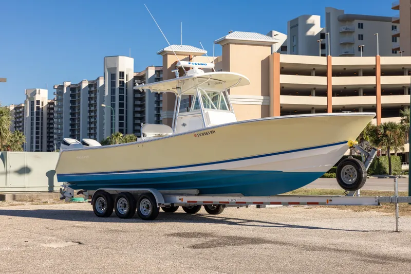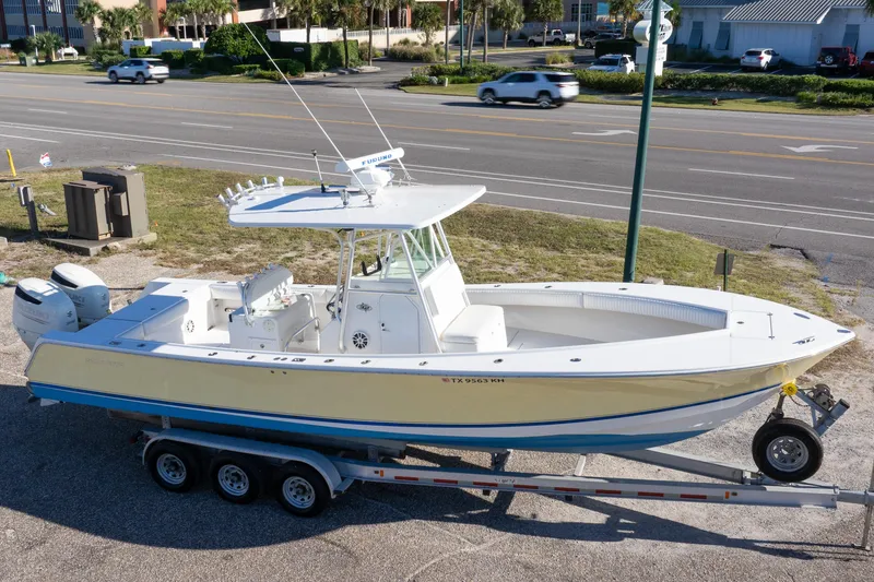 Here is your chance at a proven offshore machine, in a classic fighting lady yellow hull color. This 2005 Regulator 32 CC was repowered in 2018 with a pair of Suzuki DF300s and her current engine hours sit at 247. She is in great shape and provides an excellent value for someone wanting a premium 30'+ offshore boat with a premium ride. The open bow model is the true classic of the Regulator fleet and makes for an efficient offshore platform. This Regulator 32 would make for an awesome deep-dropping boat. She is solid under your feet in swells, and with all of her bow flare, very dry. The Magic Tilt trailer is original with recent upgrades including new axles, tires, and lights. Her owner took great care of her and it shows. She is priced to move and ready to make her new owner very happy.