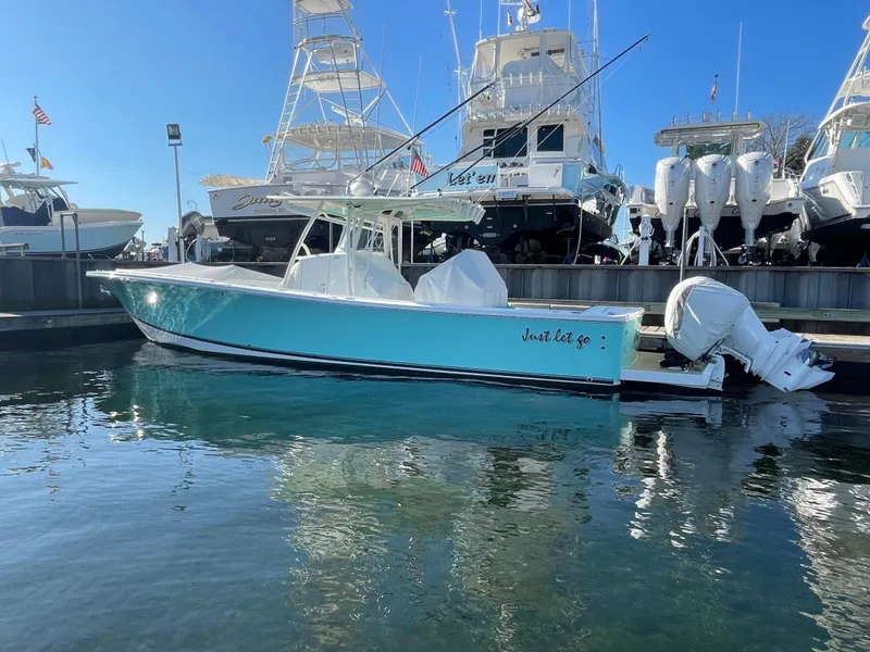 Impressive 2019 Regulator 34 with Triple Yamaha F300's with only 305 hours! Seafoam Green Hull with White motors. Professionally maintained and upgraded here at our yard.