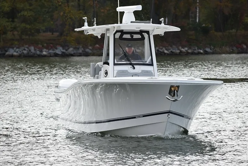 Spectacular lift kept Regulator 34 Center Console with triple Yamaha F300's under 200 hours, joystick, autopilot, mezzanine seating, dove gray upholstery and no bottom paint. Sold new by Bluewater Yacht Sales, she's a one owner boat maintained by Bluewater techs and up to date on all service. Always professionally detailed and waxed regularly. Fully optioned with everything except gyro stabilization. See the complete option list under the "Factory Options" tab below. Custom aftermarket black antennas, custom boot stripe and carbon fiber wheel were added after delivery. Used exclusively in the mid-Chesapeake Bay and Eastern Shore Region as a day cruiser. Call, text or email with any questions.