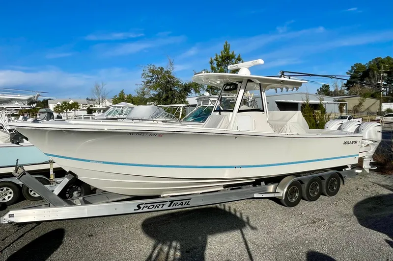 The Regulator 34 is a true center console, with a design that maximizes space to rival its 39-foot competitors. Now available with twin Yamaha 425s, the Yamaha Helm Master® EX option and Seakeeper® 2, the 34 is ready for action. Fishermen's favorites include a huge forward deck, 42-gallon transom livewell, 220-quart transom fishbox, and 3X Deluxe Tackle Center with rigging station. Upgrade to the new 3X Deluxe Mezzanine Tackle Center for additional seating, storage, and seatside rocket launchers to keep you on the fish, then let out your lines with the optional Taco® Grand Slam 390 outrigger bases with 20' Carbon Fiber telescoping poles. Ride in comfort with our integrated wraparound windshield and optional helm A/C, Fusion® entertainment and a new look at the helm - plus starboard boarding and dive door, optional forward sun shade and cockpit SureShade®. Below deck, the berth sleeps two and features abundant rod rack storage, among other overnight amenities, making the 34 a favorite again and again.