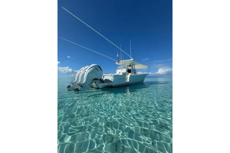 Very well maintained and equipped Regulator 34 available for immediate delivery. Triple White 300 Yamaha's with approx 262 hours, recent service with water pump and warranty through 03/28/2029. Options include full hull Abaco sky hull color, navy boot stripe, bow shade, custom covers and curtains, gemlux outriggers, t-top rocket launcher, t-top storage compartment, mezzanine seating, white upholstery, transom rod holders, electric reel plugs, cockpit engine flush, macerated in floor fish box, underwater lights, phender pro clips, sea keeper 2, windlass, dual 16" garmin, vhf, airmar B275LHW transducer, helm master joystick, auto pilot, garmin gxm 54, and an inductice cell phone charger. **Boat is Bottom Painted** Includes All Welded Magic Tilt Trailer.