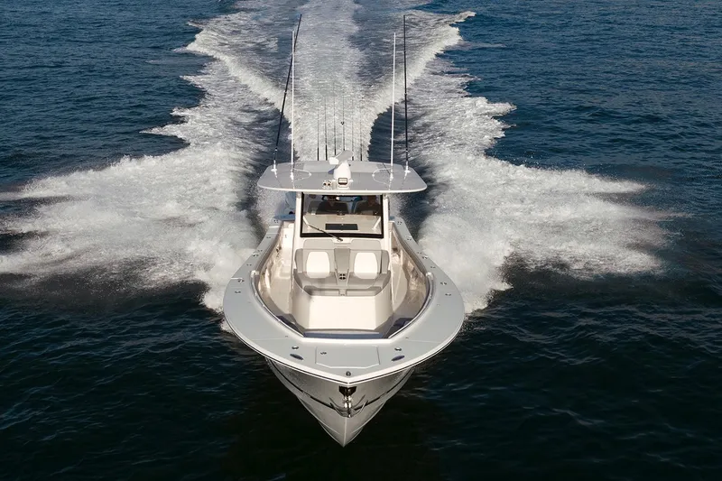 Powered by quad Yamaha 425s with Helm Master® EX and equipped with Seakeeper® 5, the 41 meets your every offshore need. The new Offshore Command Center features Garmin® Multi-Function Display with Digital Switching and Monitoring, along with proprietary Regulator MyHelm™ interface to seamlessly and intuitively connect key functions in one application – with wireless key fob to trigger lighting, batteries, and more as you approach or disembark with the touch of a button. Serious anglers will love the optional Taco® Grand Slam 500 outrigger bases with 20’ HD Carbon Fiber telescoping poles and huge livewell and fishbox capacity. Aft mezzanine seat with prep & tackle center and overhead SureShade® provide additional cockpit seating without compromising fishing amenities. Easy tower access makes the dual helm even more attractive and below deck, the newly-redesigned cabin features Chilewich interiors, galley kitchen, double berth, and spacious head with shower, allowing you to accommodate friends and family with ease.