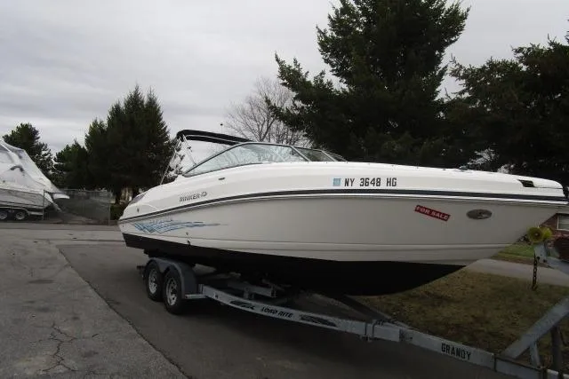 Powered with Sea Core 496 MAG and Bravo 3 drive with 686 hours, bottom paint, top, bow & cockpit covers. Triple step swim ladder, pop up cleats, walk thru transom, cockpit wet bar and snap in/out cockpit carpet. 12 volt outlet, in dash depth finder, Lowrance global map 5200C and Fusion stereo. Flip up bolster seats, pump out head, trim tabs and bow swim ladder. This sale does not include a trailer- please call for quote.