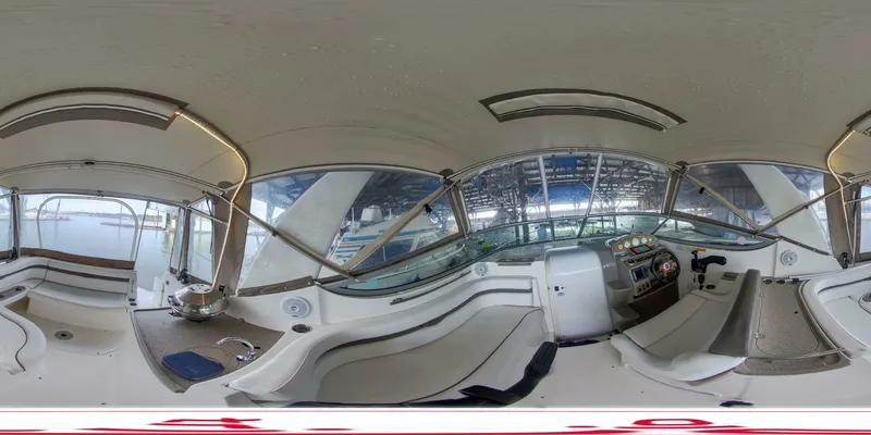 Beautiful cockpit with full instrumentation at the helm; wood grained instrument panel; wood and padded tilt steering wheel; double wide helm seat with thigh high bolster; companion seat lounger; aft cockpit seating with table; cockpit carpet; stainless steel drink holders; ample trunk storage; cockpit wet bar with Corian® countertops, fresh water sink, refrigerator, storage and integrated trash container; stainless steel handrail; stereo speakers; courtesy lights