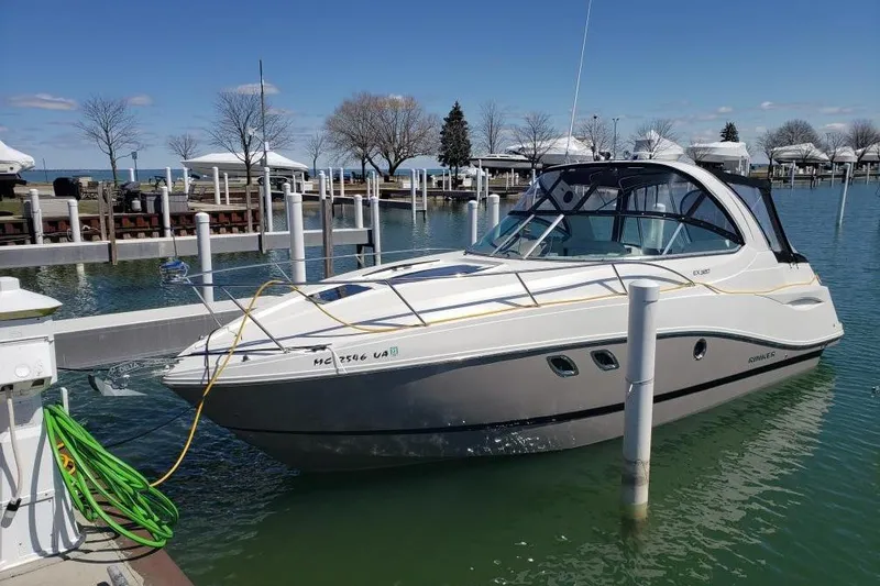 Freshwater / Great Lakes boat since new this vessel features Twin MerCruiser 350-Mag 300-hp Gas Engine's with Bravo III Sterndrives and only 214 original hours. Notable features include but are not limited to the following: Air-Conditioning & Heat (1-Unit), Head (Techna) w/Vanity/Sink/Shower, Built-In Screen Door, Walk Through Windshield, Windlass Anchor, Sun-Pad, Canvas Enclosure w/Forward Poly-Carbonite Windows, Cockpit Wet Bar w/Sink/Refrigerator, Blender, Power Engine Hatch, Raymarine Color NAV-System, Premium Sound System w/Bluetooth, Snap-in Snap-out Cockpit Carpeting (2 Sets), Bow and Stern Thrusters with Remote and MUCH more!