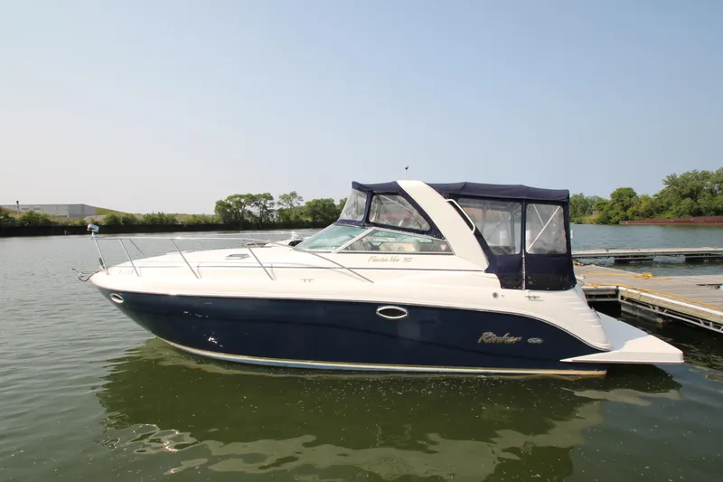 The perfect choice for cruising, this 2005 Rinker 312 Fiesta Vee is an attractive yacht with twin 5.0GXI Volvo sterndrives w/stainless steel props, 280HP, only 605 hrs. Cruises at 22 kts, max at 35 kts plus. Kohler 5kw Gen w/ 35 hours. The helm with double-wide helm seat for more space for electronics. Also has reverse cycle A/C w/heat, wet bar, battery charger, fuel shutoff/crossover valves, trim tab indicators, power assisted hatch engineroom. Electronics include VHF radio w/external speaker, Lowrance Global Map 3300C GPS, compass, and depthfinder. Galley has beautiful Cherrywood cabinetry, stainless steel sink, convertible dinette, beige upholstery, built-in coffeemaker, 2-burner stovetop, microwave, frig w/freezer. Entertainment: Fusion MS-IP600 stereo w/AM/FM, and/remote at helm and transom.TV w/DVD. On deck: windlass w/remote at helm, anchor w/davit, full newer camper top canvas, fenders w/lines, elec spotlight, fresh water washdown, nav lights, swim platform w/boarding ladder, u-shaped seating in cockpit, bench seat aft. Fresh water yacht.