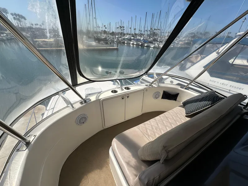 The flybridge stands out with a fiberglass hardtop, sturdy stainless supports, and a full isinglass enclosure. Helm and seating area are nicely appointed with custom Cushions.
