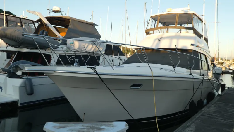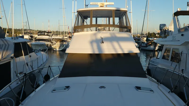 The vessel has been meticulously maintained with open checkbook with full maintenance log and updated Garmin Electronics Package with multiple displays including GPS, Plotter, HD2 Full Array Radar, Autopilot w/Remote Control, and Single Side Band Radio. The Flybrdige has a Custom Enclosure with Factory Hardtop with multiple navigation displays and also a fully equipped Lower Helm Station. The interior has been updated with Newer Ultra Leather Upholstery for corner Dinette seating, updated Galley with Newer Refrigerator, Counter Tops and Cooktop. There is also a Water Maker, Washer Dryer and Webasto Hydronic Diesel System for extended Crusing. The oversized Cockpit has a Half-Bimini, walk-through transom door to extended swim platform with Weaver Davit System and Newer Tender. The vessel was recently service, detailed and bottom painted 2025 and moorage may also be transferable!