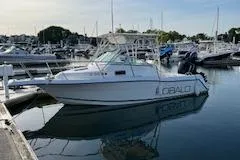 Overview: Redesigned version of Robalo's original 2440 Walkaround (1993-96) with more cockpit space, increased transom deadrise (from 20 to 22 degrees), and a stylish wrap around windshield. A better head-sea boat than her predecessor! Features: Integral bow pulpit; twin transom doors; livewell; in-deck fish boxes; fresh/raw-water wash downs; trim tabs: deluxe helm chairs; rod storage racks; cockpit bolsters; rear bench seat with backrest; anchor locker. Most were sold with optional hardtop. Cabin with convertible dinette/V-berth, galley with sink and refrigerator, portable head sleeps two. Performance: Top speed in the high 30s/low 40s with single 250 outboard.