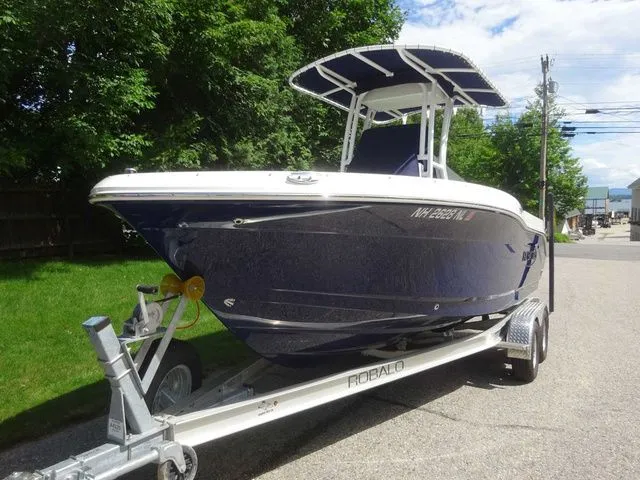 2023 Robalo 202 Explorer, This clean, late model boat features a solid Hull Biscayne Blue Gel Coat, Harbor Biscayne Blue interior, biscayne blue canvas, tilt steering helm, white powdercoated t-top, electronics box, dual battery setup with crossover switch, Simrad GO7 chartplotter, trim tabs with indicators, Seadeck helm mat, porta potti, bow filler cushions, cockpit table, custom anchor, stainless steel drink holders, spare tire kit, console/leaning post covers, a Coyote tandem axle trailer and a custom enclosure (bow cover and front/side isenglass) for those cold days. Brokerage boat-trade in's not accepted.