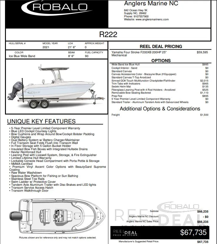 This 2026 Robalo R222 center console is powered by a Yamaha 200. It is loaded up with standard features from the fold down aft bench seat to the comfortable bow seating. There is also two 30-gallon fish boxes to help keep your catch fresh while fishing, or they can be used for storage. The boat is already equipped with a Simrad GPS/Fishfinder.