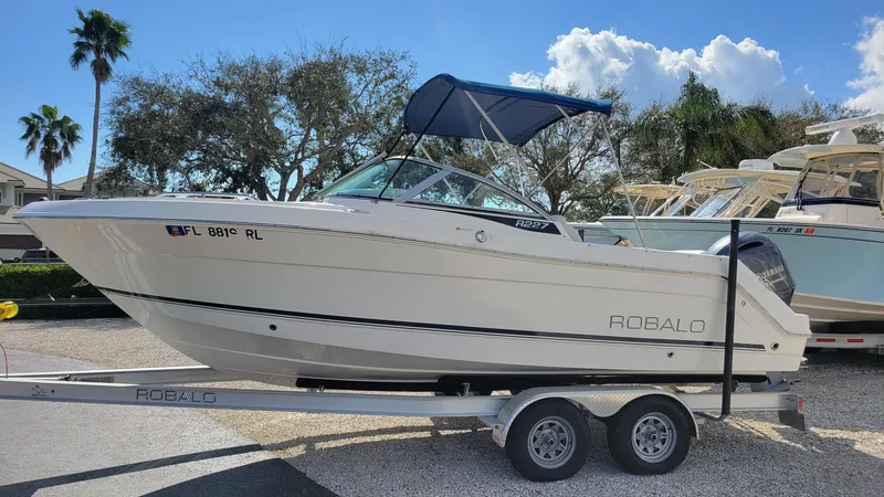 Boats like the R227 are the reason why dual console outboards are one of the hottest sellers on the water today. In what other 22-footer can you fish at sunrise, wakeboard all day and cruise under the moonlight? As a fishing machine, the R227 includes secure rod storage, a raw water wash down, a self bailing cockpit and a 20-gallon livewell. Up front, the bow area easily converts from a casting platform to wraparound seating. In the cockpit, the R227 features a large enclosed head and a deep infloor ski locker with lockable rod storage. Stainless steel hardware including flush pull latches and electro-plated thru hull fittings are what you'd expect from Robalo. Key options include a must have Bimini Top with windscreen, ski tow bar, snap-in carpet and a freshwater shower.