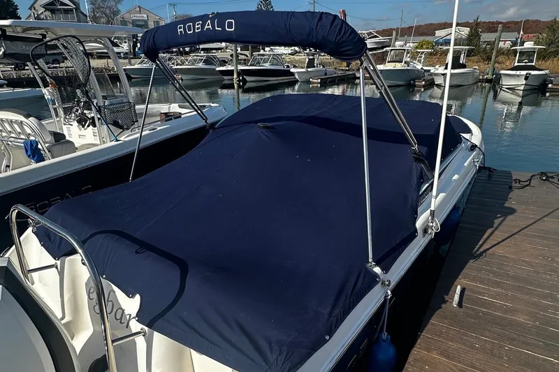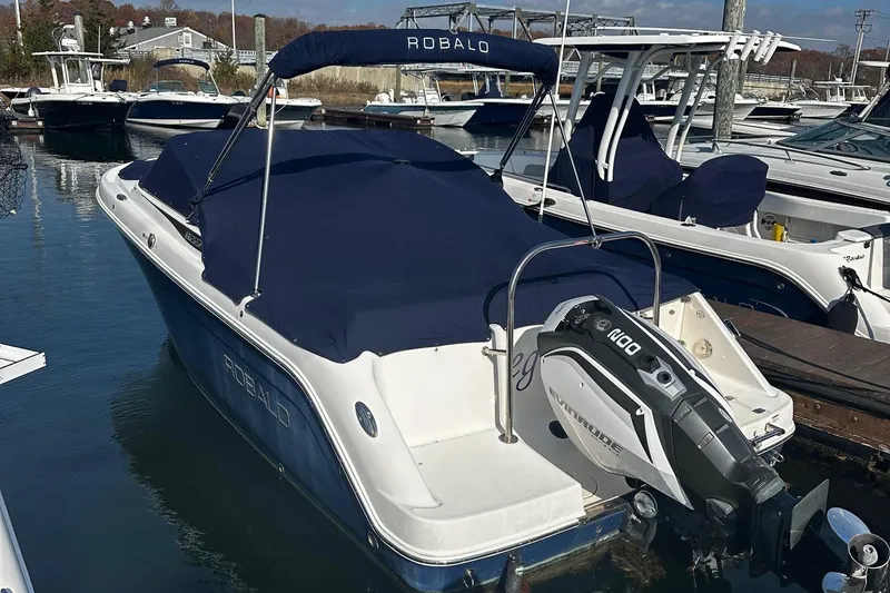 Boats like the R227 are the reason why dual console outboards are one of the hottest sellers on the water today. In what other 22-footer can you fish at sunrise, wakeboard all day and cruise under the moonlight? As a fishing machine, the R227 includes secure rod storage, a raw water wash down, a self bailing cockpit and a 20-gallon livewell. Up front, the bow area easily converts from a casting platform to wraparound seating. In the cockpit, the R227 features a large enclosed head and a deep infloor ski locker with lockable rod storage. Stainless steel hardware including flush pull latches and electro-plated thru hull fittings are what you'd expect from Robalo. Key options include a must have Bimini Top with windscreen, ski tow bar, snap-in carpet and a freshwater shower.