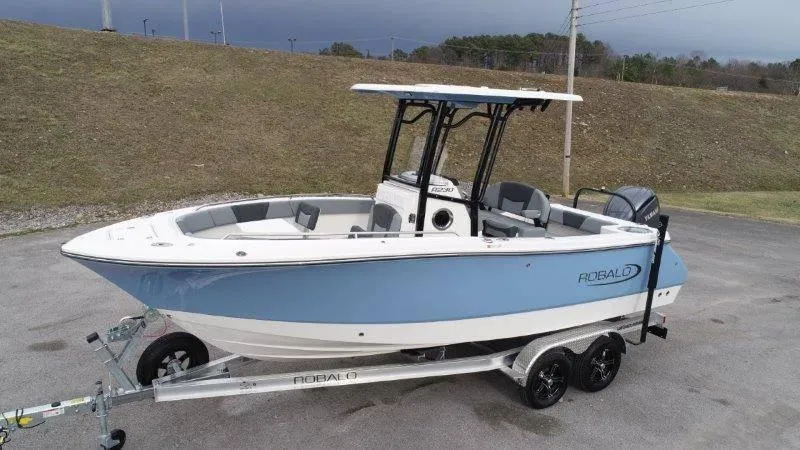 2025 Robalo R230, 2025 Robalo R230 • 30 Gallon Insulated Livewell with LED Lighting, Blue Gelcoat Finish, and Adjustable Flow Valve • 5-Year Premium Level Limited Component Warranty • Blue LED Cockpit Courtesy Lights • Digital Gauges • Dual Battery System with Crossover Switch and Voltage Sensing Relay • Fiberglass Hardtop with Powdercoated Frame: Includes: Rod Holders, Storage Box, LED Spreader Lights, & Integrated Console Grab Rails • Full Transom Seat Folds Flush into Transom Wall • In-Floor Bow Storage • Insulated and Overboard Draining Bow Fishboxes • Kevlar Reinforced Hull • Limited Lifetime Hull Warranty • Lockable Console Head Compartment w/ Porta Pottie & Storage • NMMA Certified • Poured Composite Transom Coring • Premium Envision Marine Silicone Upholstery • Premium Powdercoated Leaning Post w/Backrest, Flip-Up Bolsters, and Rod Holders with Cooler • Raw Water Washdown • SeaStar Hydraulic Steering with Tilt Helm • Stainless Steel Toe Rails • Swim Ladder w/Protective Cover • Tinned Copper Wiring with Waterproof Connectors • Transom Service Access Hatch • U-Shaped Bow Seating • Wrap Around Bow and Cockpit Bolster Pads •Hull Side Gelcoat - Steel Blue •Cockpit Interior - Shadow •Canvas Color - Black (If Equipped) •Canvas Accessories Color - Black (If Equipped) •Hardtop Underside Gel Color - Steel Blue •Forward Canvas Fly - Black Canvas •Mooring Cover •Dual Battery Charger •JL Audio Sound System Upgrade •Twin Simrad NSS9 EVO3S •Simrad NMEA 2000 Starter Package with Audio Interface •Trim Tabs with Indicators •Pre-Wire for Trolling Motor •Seadek Helm Mat •Gravity Discharge Toilet with 6.5 Gallon Holding Tank •Bow Filler Cushion •Bow Table with Dedicated Storage •Leaning Post with Backrest, 4 Rod Holders, Dual Flip Up Bolsters •Cooler and Arm Rest - Black Powder •Removable Bow Seating Backrest •Custom Anchor •Fresh Water Shower •Ski Tow - Black Powder Coated •5 Year Premium Level Limited Component Warranty •Trailer - Aluminum Tandem Axle with Aluminum Wheels •Spare Tire Kit for Aluminum Trailer - Aluminum Wheel